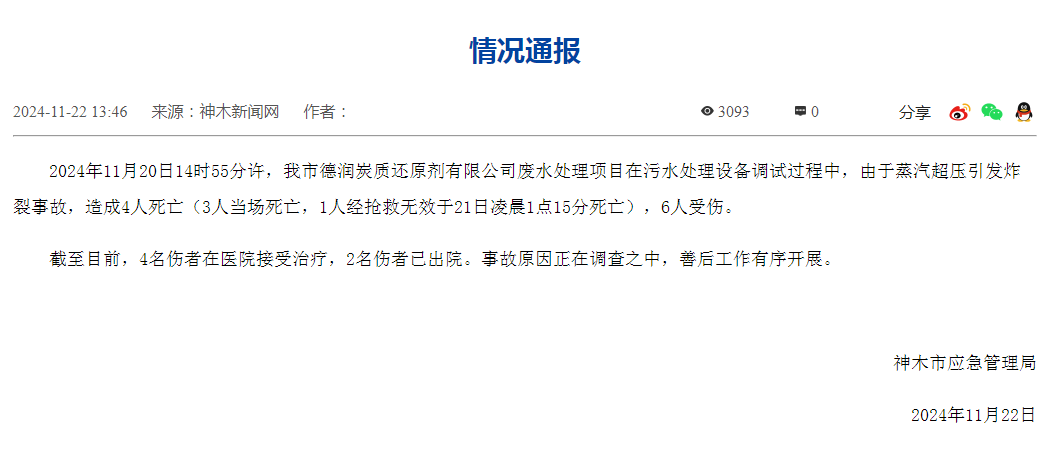 炸裂事故,4死6伤!紧急提示据陕西省神木市应急管理局通报,2024年11月20日14时55分许,陕西神木市德润炭质还原剂有限公司废水处理项目...
